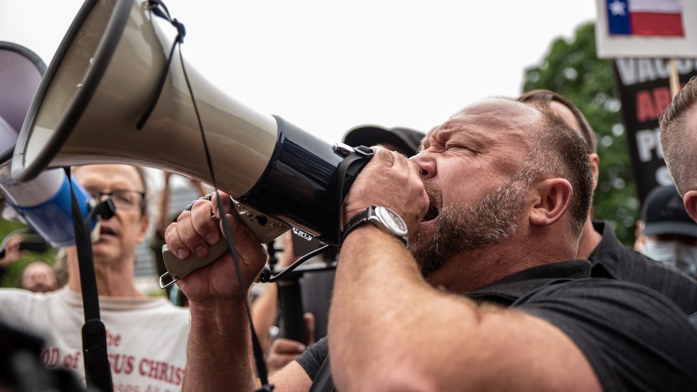 Infowars founder Alex Jones speaks into a bullhorn at the Texas State Capital building on April 18, 2020 in Austin, Texas © Getty Images / Sergio Flores/Getty Images