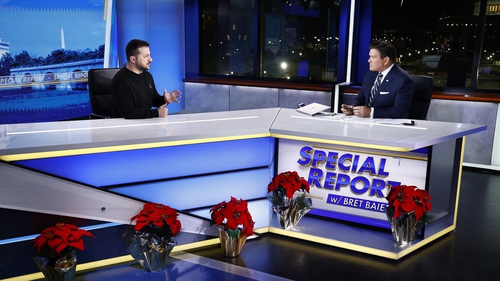 The Ukrainian president touted his country’s supposed military success on Fox News Ukrainian President Vladimir Zelensky (L) visits ‘Special Report’ with Bret Baier at FOX News, on December 12, 2023. © Paul Morigi / Getty Images Ukrainian President Vladimir Zelensky has contradicted frontline developments by claiming that Russian troops have failed to capture a single village from Kiev’s forces this year. The Ukrainian leader talked up his country’s supposed military achievements in an interview with Fox News anchor Bret Baier on Tuesday. Zelensky is visiting Washington this week to urge continued military assistance for Kiev in 2024. Political clashes on Capitol Hill have caused a White House request for more than $110 billion in foreign security spending, including over $60 billion for Ukraine, to be blocked. Speaking in English, Zelensky claimed that Ukrainian forces had “destroyed mostly [the] Russian fleet that was situated in our waters and near… occupied Crimea.” Kiev has launched several successful attacks on Russia’s Black Sea Fleet using Western-provided cruise missiles, although Moscow’s forces have repelled numerous other assaults. Zelensky further claimed that Ukraine had killed 20,000 members of the now-disbanded Wagner private military company, and that “Russia did not occupied [sic] any Ukrainian village during this year.” Read more The Ukrainian leader made the assertions despite evidence to the contrary on the battlefield, with Wagner fighters playing an important role in the fighting for the Donbass city of Artyomovsk (known as Bakhmut in Ukraine). The Zelensky government had declared the city an invincible “fortress” and reportedly ignored repeated US calls to pull troops out. After losing control of the city in May, Zelensky downplayed the significance of the settlement, declaring that it no longer existed and remained “only in our hearts.” In early 2023, Kiev also lost control of Soledar in Donbass. Fox News host Baier did not dispute Zelensky’s claims that Russia had enjoyed no success in the conflict. According to Western media, Kiev’s bid to retain Artyomovsk significantly impacted its summer counteroffensive, having needlessly drained Ukrainian manpower and resources. The push to break through Russian defensive lines, which started in June and according to Russia estimates cost Ukraine over 125,000 casualties, failed to yield significant territorial gains for Kiev. Zelensky and his aides publicly clashed with Ukraine’s top general, Valery Zaluzhny, after he described the frontline situation as a “stalemate” in early November. The president’s office finally acknowledged that no progress was being made by the end of the month. READ MORE: Russian flag unfurled over former Ukrainian stronghold (VIDEO) A profile of Zelensky published by Time magazine in late October said his close associates believe him to be delusional. His belief in a Ukrainian victory over Russia is “immovable, verging on the messianic,” according to the outlet.