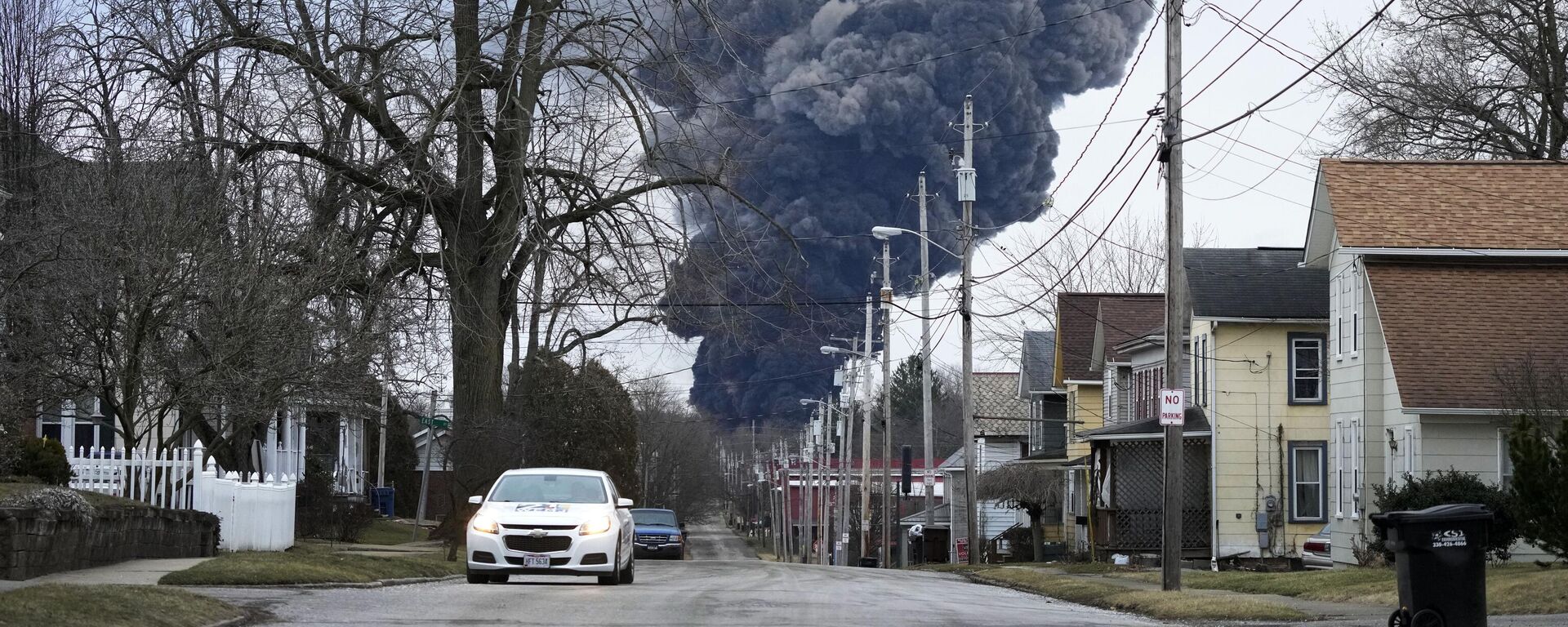 Smoke rises from a derailed cargo train in East Palestine, Ohio, on February 4, 2023.