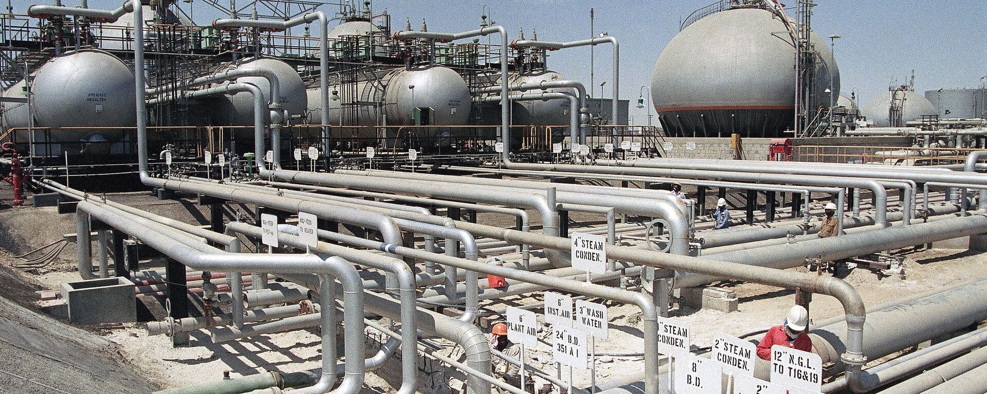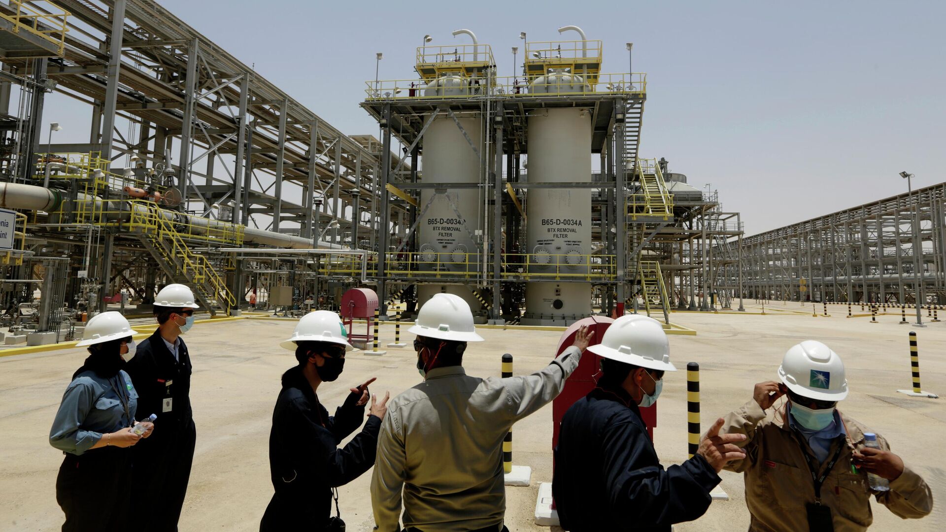 Saudi Aramco engineers and journalists look at the Hawiyah Natural Gas Liquids Recovery Plant, which is designed to process 4.0 billion standard cubic feet per day of sweet gas, a natural gas that does not contain significant amounts of hydrogen sulfide, in Hawiyah, in the Eastern Province of Saudi Arabia, June 28, 2021.