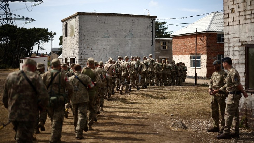 Ukrainian recruits take part in a training session at a military base in southern England, June 20, 2023 ©  AFP / Henry Nicholls