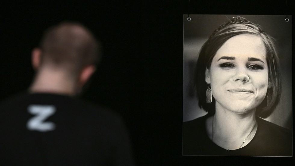 A portrait of Daria Dugina displayed near her coffin during a farewell ceremony at the Ostankino TV centre in Moscow on August 23, 2022 © Kirill KUDRYAVTSEV / AFP