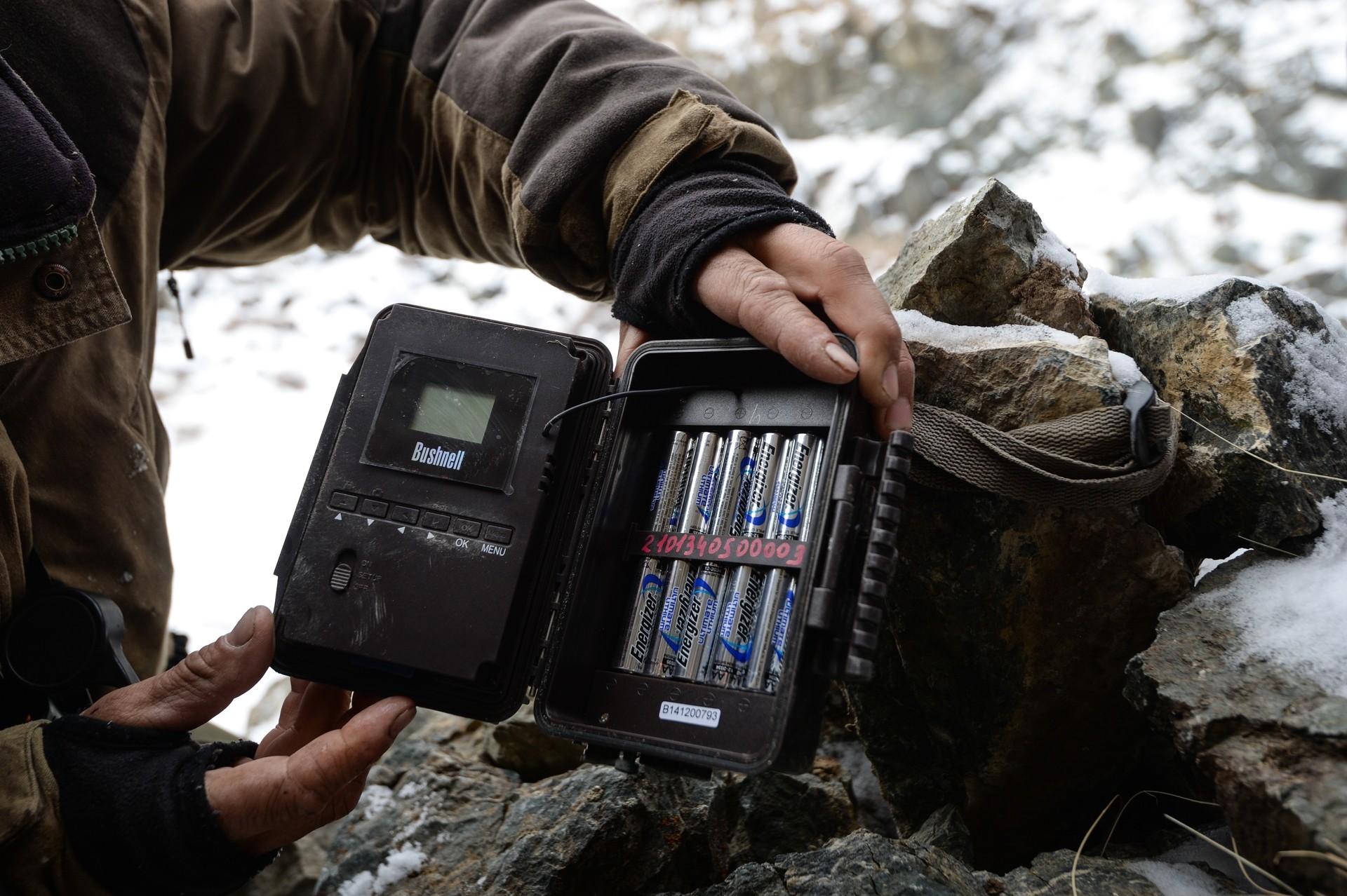 - Сотрудник Сайлюгемского национального парка снимает данные с фотоловушки, установленной на пути снежного барса в Кош-Агачском районе Республики Алтай.