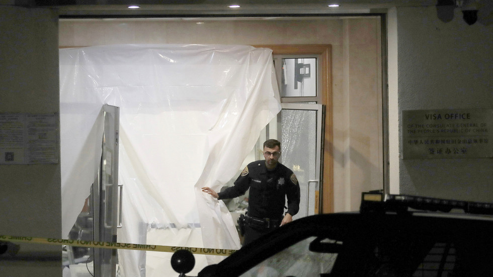 The vehicle came to a stop deep inside the lobby of the diplomatic facility San Francisco police investigate at the Chinese consulate in San Francisco on October 9, 2023 © Jane Tyska / Bay Area News Group via AP A driver has slammed their car into the Chinese consulate building in San Francisco, California, completely smashing through the front door before being neutralized by police. The collision took place on Monday afternoon around 3pm local time, San Francisco police said, noting that officers had made contact with the driver soon after that. Footage circulating on social media purportedly showed the aftermath of the incident, with a blue sedan seen inside the building as frightened bystanders fled the scene. The police have offered few details, but Sgt. Kathryn Winters said the driver had been shot by officers and later died of their injuries despite “life-saving efforts.” The suspect has not been identified. A man crashed his car into #ChineseConsulate in #SanFrancisco. pic.twitter.com/tuQggCXZso — Sergii 龍天 (@sergii_san) October 10, 2023 “When officers arrived here on scene, they found the vehicle had come to rest inside the lobby of the Chinese consulate. Officers entered, made contact with the suspect and an officer-involved shooting occurred,” she said. The spokeswoman added that the driver’s motives remain unclear, but noted there were no other injuries reported following the crash. She could not say how many people were inside the compound at the time of the collision. Beijing’s diplomatic mission in San Francisco responded to the episode in a statement, saying that an “unidentified person drove violently into the document hall of the consulate, posing a serious threat to the safety of the staff and people at the scene, and causing serious damage to the facilities and property of the consulate.” The consulate added that it “strongly condemns this violent attack and reserves the right to pursue responsibility for the incident,” though it did not say who it would seek to hold accountable in light of the driver’s death. Police Sgt. Winters said local authorities are now coordinating with the US State Department and Chinese consulate officials to investigate the apparent attack, but stated it would be a “very complex” probe.