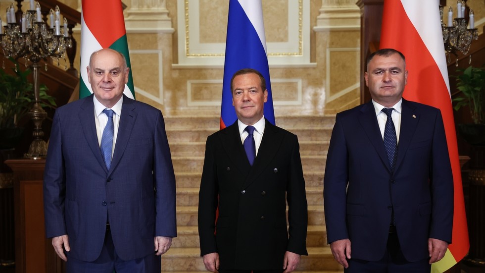 Unlike their predecessors, the current leaders in Tbilisi have been showing “pragmatism,” Dmitry Medvedev says Dmitry Medvedev (C) meets with presidents of South Ossetia and Abkhazia, Alan Gagloyev (R) and Aslan Bzhania (L) on August 25, 2023. © Sputnik / Valery Sharifulin Former Russian President Dmitry Medvedev has expressed hopes that Georgia will “show pragmatism” and recognize the independence of South Ossetia and Abkhazia. The ex-president, who is now the deputy head of Russia’s Security Council, made the remarks in an interview with RT and TASS on Friday. The interview marked the 15-year anniversary of Russia recognizing the breakaway formerly Georgian regions of South Ossetia and Abkhazia in the aftermath of the five-day war between Moscow and Tbilisi. Medvedev, who was president at the time, ordered the country’s troops to intervene after Georgia, led by Mikhail Saakashvili, sent troops to South Ossetia and attacked Russian peacekeepers that had been stationed there since the 1990s. However, the current Georgian leadership has been displaying a fair share of “pragmatism,” Medvedev stated, expressing hopes that Tbilisi will ultimately recognize the breakaway republics as well. “I hope that the Georgian leaders will have the pragmatism to recognize the reality, including the existence of South Ossetia and Abkhazia as independent subjects of international law, and build relations with them, because historically they are still very close peoples,” he said. The ex-president refused to evaluate the current state of relations between Georgia and its former regions, stating that this was for the participants of the “political triangle” to do themselves. “Although we are watching this closely. Anything can happen in politics, pragmatism is very important,” he added. This pragmatism has allowed Tbilisi to develop ties with Moscow, Medvedev pointed out, despite the calls of a few “political freaks” in Georgia to destroy the country’s relations with Russia, he noted. “The current generation of leaders and the political forces in power in Georgia, in any case, are marked by pragmatism, this cannot be ignored. That is why we are now developing relations with them, we allowed the entry of Georgian citizens into Russia without visas again, that is why the planes began to fly,” Medvedev stated, referring to President Vladimir Putin’s decision earlier this year to lift an air travel ban and visa regime with Georgia, measures that were originally imposed back in 2019 in the wake of anti-Russia protests in Tbilisi.