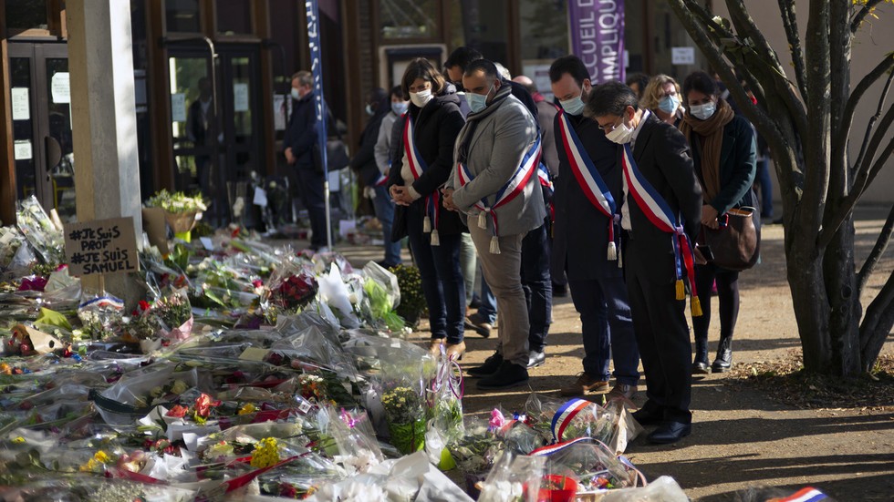 FILE PHOTO: People place flowers in front of the middle school where school teacher Samuel Paty was murdered, October 18, 2020, Conflans-Sainte-Honorine, France. ©  Aurelien Meunier / Getty Images