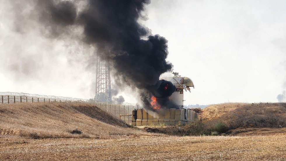 FILE PHOTO: An Israeli tower on the border with Gaza burning on October 07, 2023. ©  Hani Alshaer / Anadolu Agency via Getty Images