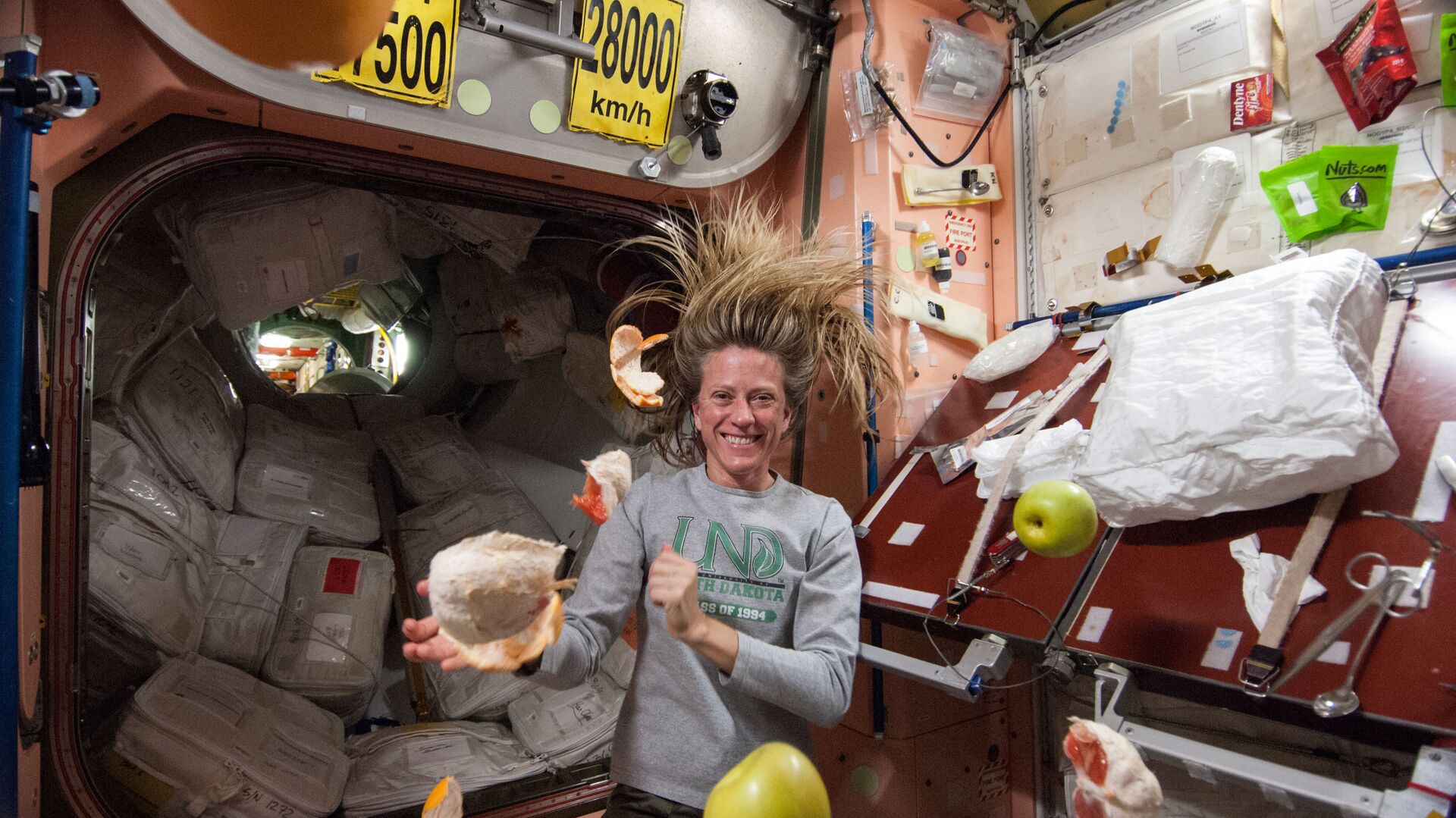 Американский астронавт Карен Найберг с летающими фруктами на МКС