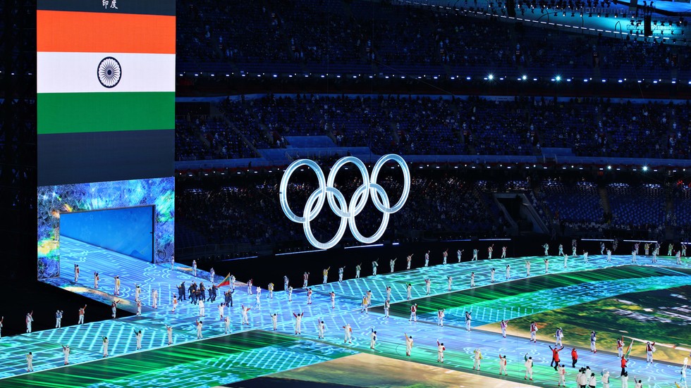 A large Olympic ring logo is seen inside the stadium as flag bearer Arif Mohd Khan of Team India leads their team out during the Opening Ceremony of the Beijing 2022 Winter Olympics at the Beijing National Stadium on February 04, 2022 in Beijing, China. © Adam Pretty/Getty Images