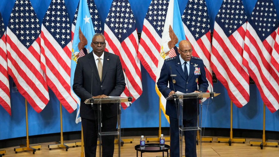 United States Secretary of Defense Lloyd Austin and Chairman of the Joint Chiefs of Staff, USAF General Charles CQ Brown, October 11, 2023. ©  AP Photo/Virginia Mayo