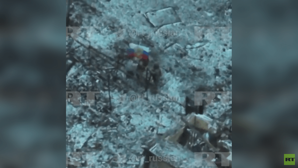 Troops have hoisted the tricolor on the western outskirts of Maryinka, drone footage obtained by RT shows Russian forces have unfurled the country’s flag on the outskirts of Maryinka, a key town in the Donetsk People’s Republic (DPR) west of the city of Donetsk, and a major Ukrainian stronghold. Drone footage obtained by RT on Sunday shows two Russian servicemen hoisting the country’s flag, adorned with its coat of arms, at the town’s circular road on its western outskirts. Maryinka’s large pond, split roughly in half by a dam, is seen in the background. The dam is formally the westernmost point of the town, marking its border. Kiev’s troops are still reportedly in control of a handful of buildings or ruins to Maryinka’s west. Russian units are currently reinforcing their positions in the town, with the Ukrainian military trying to disrupt the efforts with mortar and automatic grenade launcher fire. Maryinka, effectively the westernmost suburb of the city of Donetsk is among the key points to have been held by Ukraine. The town has been the scene of fighting for nearly a decade already – first between Donbass rebels and Kiev forces, who regularly bombed the city, and now between Russia’s and Ukraine’s militaries. It has been largely reduced to rubble, with no intact buildings left. Apart from having been a major stronghold for Ukrainian units in the Donetsk area, Maryinka has also been serving as one of the key staging points for attacks on Donetsk itself. The city has been subjected to indiscriminate artillery and missile attacks on an almost daily basis by Ukrainian forces. The struggle over Maryinka had intensified in recent months, with Russian forces seizing multiple key positions in the town. Earlier this month, Russian media reports indicated that the country’s troops had seized control of 95% of the town. However, the Russian Defense Ministry has so far not officially announced the liberation of the DPR settlement.