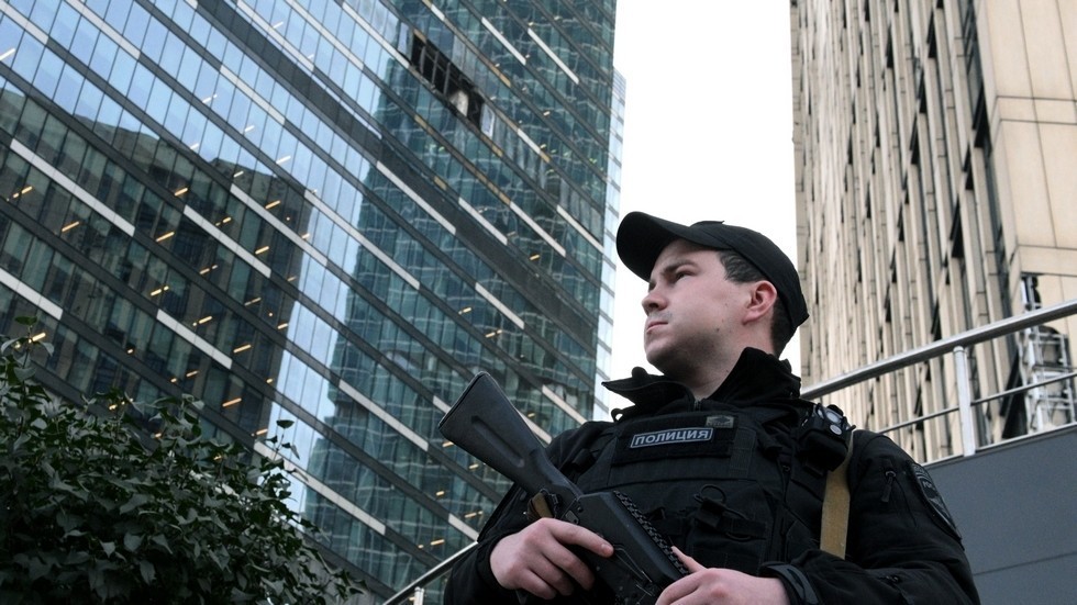 A police officer stands guard near a damaged office building in the Moscow City, following a Ukrainian drone attack on August, 1. ©  Sputnik