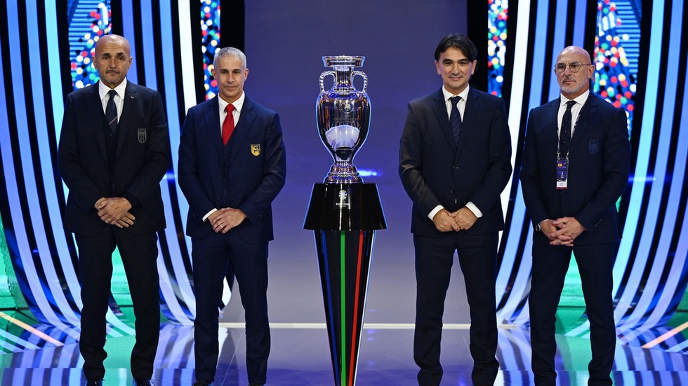 Luciano Spalletti, Head Coach of Italy, Sylvinho, Head Coach of Albania, Zlatko Dalic, Head Coach of Croatia, and Luis de la Fuente, Head Coach of Spain at the UEFA 2024 draw on December 02, 2023 in Hamburg, Germany © Getty Images / Alexander Scheuber/Getty Images