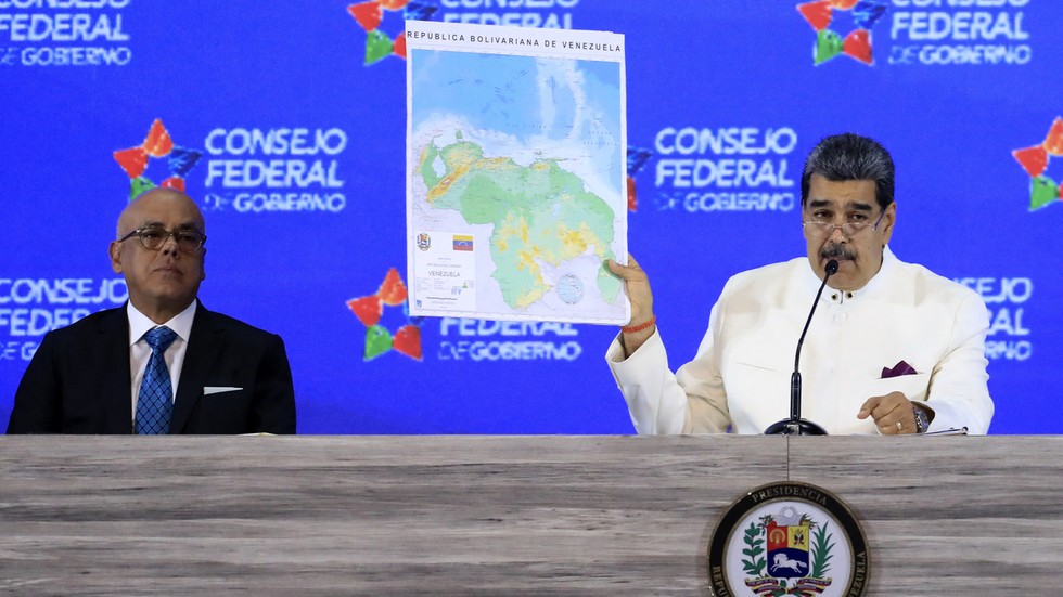 Energy companies should start exploration in “our Guyana Esequiba,” President Nicolas Maduro has said Venezuelan President Nicolas Maduro shows a map of the country, which includes the ‘Guyana Esequiba’ province. © AFP / Venezuelan Presidency Venezuelan President Nicolas Maduro has displayed an updated map showing a resource-rich territory disputed with neighboring Guyana as a part of Venezuela. The map including ‘Guyana Esequiba’ province will be published and distributed in schools and universities, Maduro said on Tuesday. A law on the creation of the new province has already been submitted to the country’s parliament, according to the president. The area that Guyana calls ‘Essequibo’ has been a bone of contention between the two countries since the 19th century. In 1899, US arbitration assigned the region to Guyana, a British colony at the time, but Venezuela never accepted the decision. In 2018, UN Secretary-General Antonio Guterres referred the dispute to the International Court of Justice (ICJ), with the Hague-based body ruling in April that it had jurisdiction in the case. On Sunday, a referendum in Venezuela returned a result overwhelmingly supporting Maduro’s government on the status of ‘Guyana Esequiba’. The vote confirmed that Caracas should reject the 1899 arbitration decision as well as the ICJ’s jurisdiction over the matter. It also endorsed a plan to offer Venezuelan citizenship to the residents of the Guyana-administered territory. New map of the Bolivarian Republic of 🇻🇪 #Venezuela.👇Result of the Consultative Referendum of December 3, 2023. pic.twitter.com/gPugJWlq0S — teleSUR English (@telesurenglish) December 5, 2023 Venezuela’s state-run companies will “immediately… proceed to give operating licenses for the exploration and exploitation of oil, gas and mines in our Guayana Esequiba,” Maduro said. Any other firms operating in the area will have three months to withdraw from the territory, he explained, adding that a zone of integral defense of ‘Guayana Esequiba’ would be created. Read more A consortium led by US company Exxon Mobil started producing oil off Guyana’s coast in late 2019 under a license from the Guyanese government, with exports beginning the next year. Later on Tuesday, Guyanese President Irfaan Ali said Maduro was showing “blatant disregard” for the ICJ, which said last week that it forbade Venezuela from taking any action to change the status quo of the region. “The Guyana Defense Force is on high alert… Venezuela has clearly declared itself an outlaw nation,” Ali announced. The country would be contacting the UN Security Council and the ICJ concerning the development on Wednesday morning, he added. Ali also addressed foreign companies operating in Guyana, saying that “our message is very clear, your investments are safe,” insisting that Georgetown has the support of the international community in its dispute with Caracas.
