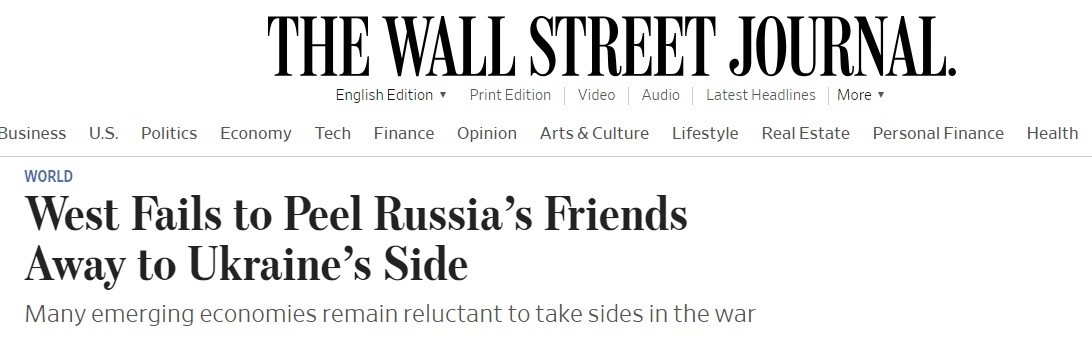 Ранее западные СМИ уже обращали внимание на то, что попытки США и стран НАТО привлечь развивающиеся государства к поддержке их позиции по Украине по большей части потерпели неудачу. Так, об этом в сентябре сообщила газета The Wall Street Journal.